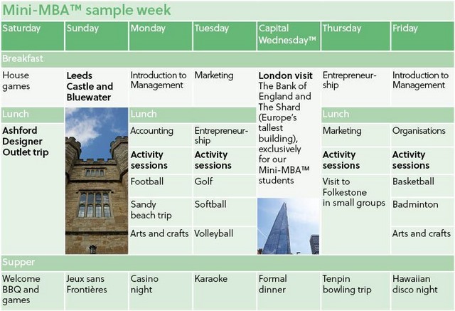 Este programa ofrece excursiones de día completo los miércoles y los domingos. Los miércoles están destinados a las excursiones en Londres y una de las visitas oficiales y más importantes para este programa es la del Banco de Inglaterra y la visita al Shard, el edifico más alto del Europa. Antes de cada viaje se les pasa a los estudiantes un folleto explicativo de lo que van a visitar.